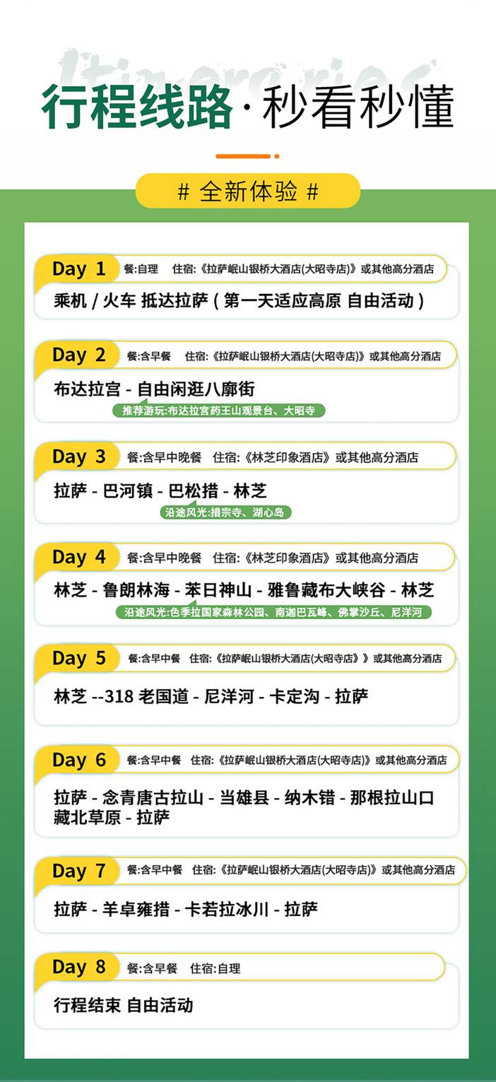 3、本线路中的淡季门票价格为参考价格,因从2018年淡季开始,西藏政府会颁布惠游政策,实施一批西藏境内景区免费的政策补贴,具体实施惠游政策时间段以西藏政府公布为准,因此本行程报价未核算部分补贴景区门票费用,任何优惠证件均无差价可退,不可抗原因无法游览或主动放弃游览的,无费用可退,具体补贴景区为西藏旅游政务网中披露的为准,如有问题,可前往查询;如因景区政策性临时调价请客人自补差价;