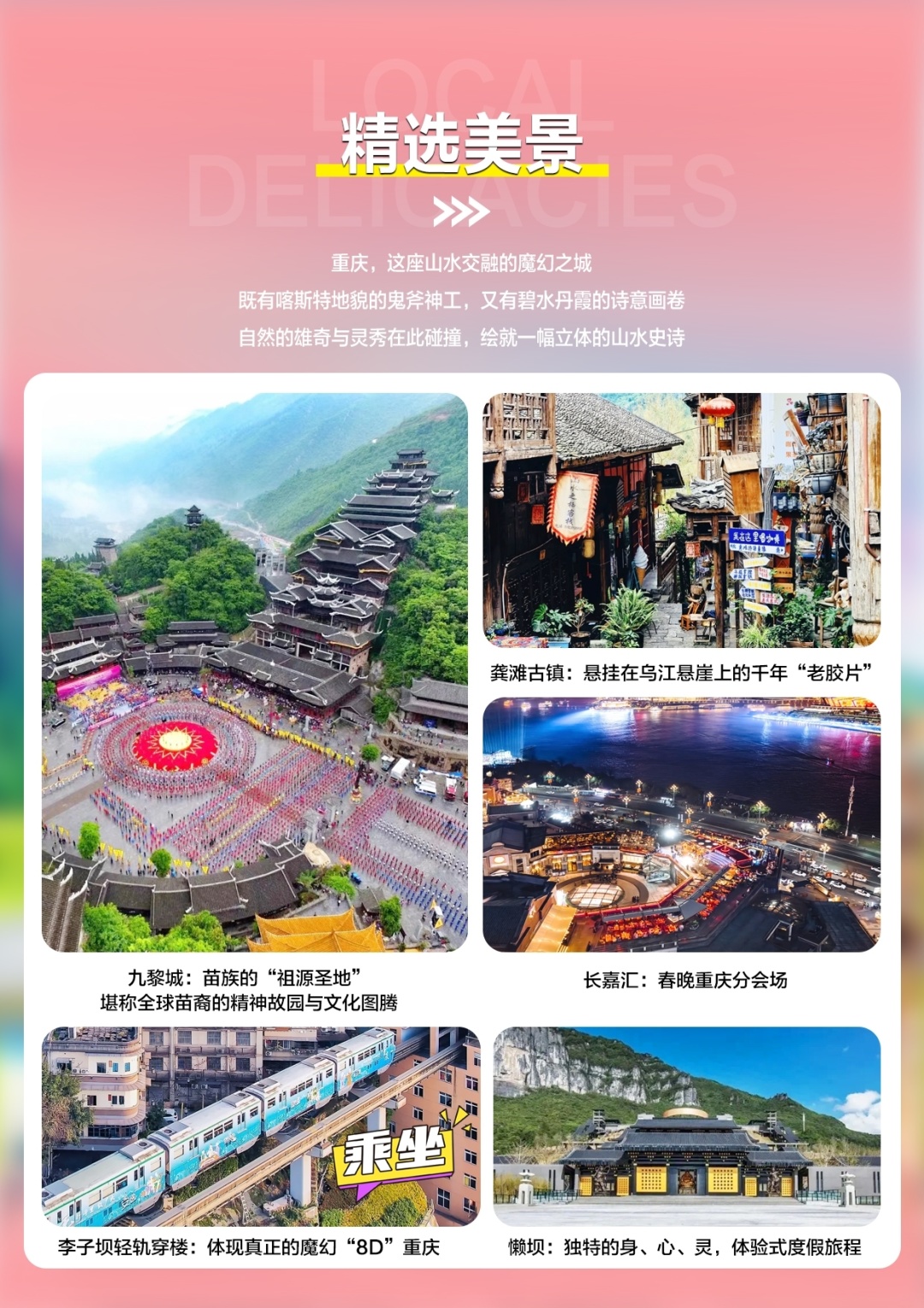 观【洪崖洞夜景】(游览时间不低于40分钟)江景和城市风貌完美融合,以75米高的超常落差,顺崖而上,高低错落、依山而建,成为备受世界瞩目的,独特靓丽的城市名片。坐拥城市旅游景观、商务休闲景观和城市⼈⽂景观于⼀体。 以具巴渝传统建筑特⾊的"吊脚楼"⻛貌为主体,依⼭就势,沿江⽽建,让游客叹为观止。