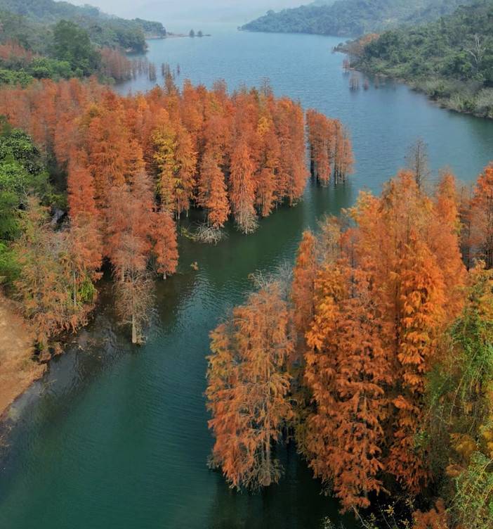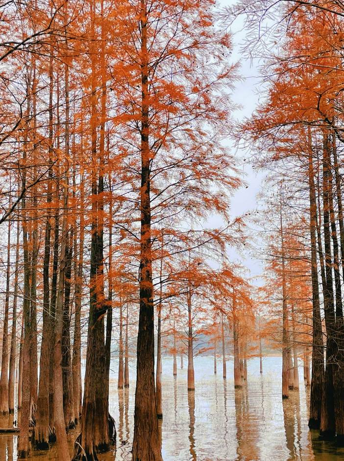 水杉倒影与水中,形成一幅唯美水墨丹青画