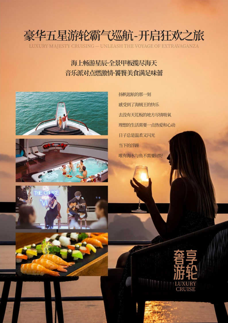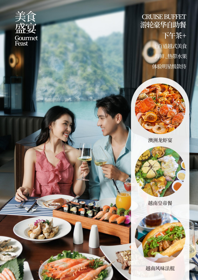 享用【游轮豪华自助餐】(100多种来自越南、日韩、欧洲的特色美食,来杯鸡尾酒或咖啡,更有一番风味)坐在游轮上一边欣赏着“海上桂林”美景,一边大快朵颐,一种美妙感觉在您的身悄悄蔓延。