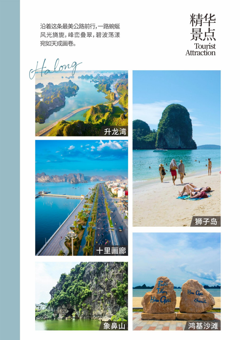 早餐后乘车打卡自然奇观【升龙湾】,沿着这条最美的公路前行,一路蜿蜒,风景优美,沿途金色的沙滩、湛蓝的海水,以及翠绿的树木让人眼前一亮,一扫视觉疲劳,夹杂着海洋气息的清新不时地拂面而来,身临其境感悟自然独特的喀斯特地貌,感受“海中有山,山下是海”的风景画卷;接着来到有近千米的海滩--【鸿基沙滩】,沙滩上椰树成林, 沙滩细白软暖,沙滩一望无际,与下龙的喀斯特地貌结合在一起仿佛一面油画,山的安静,水的静谧,海的广阔,风的抚摸。乘车前往越南版【十里画廊】,从下龙沿海公里直下,这一路风景优美,蓝天白云笼罩下宛若名师的一幅画卷。沿途群峰竞秀,百岩争奇,波光凌凌的海水点缀其间,返朴归真,再现了远古文明之典型。前往越南版【象鼻山】,象山是长期受雨水冲刷溶蚀风化而脱落,造成崩塌残余型的石梁穿洞类景观,一座形象逼真、巨大无比的天然石象立于水中,形似一头大象鼻子伸进水中饮水的巨象,又深深扎入大地之中,惟妙惟肖、灵性暗蕴,象身稳坐于水中,绿树成荫,这是喀斯特地貌的一处象征,如明月浮水,构成“象山水月”的奇特景观