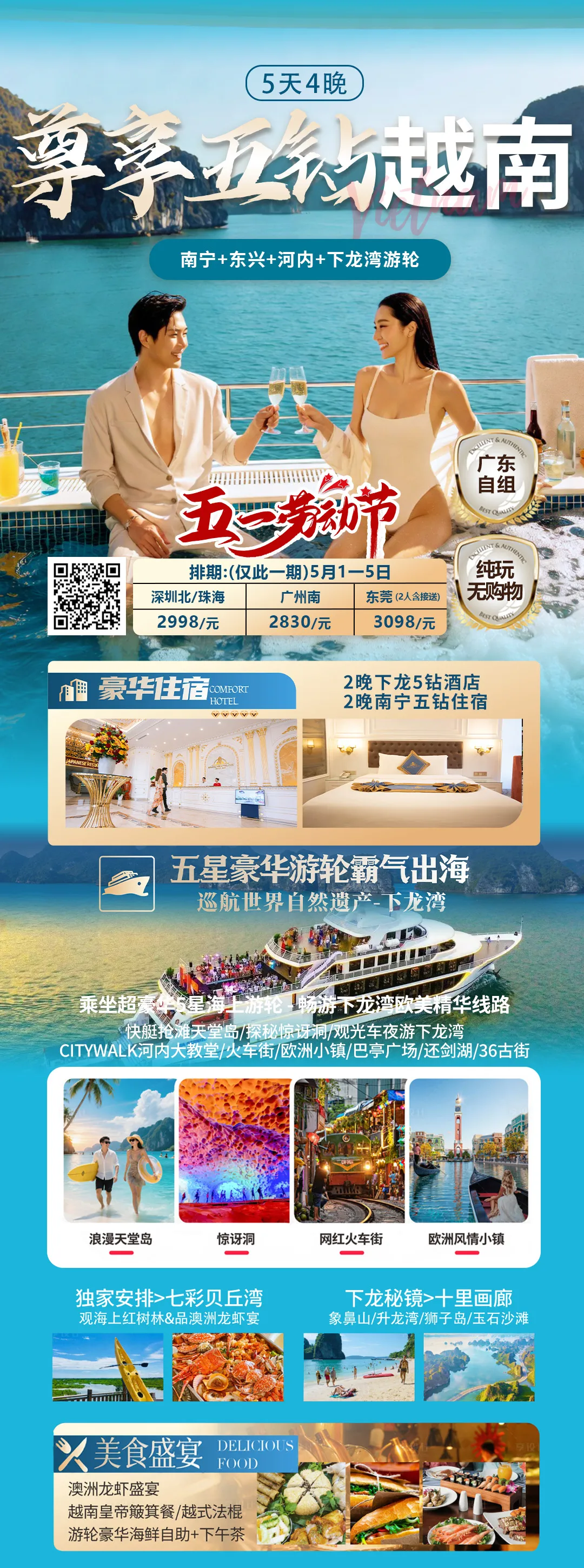 3、用餐:全程用餐7正4早,4正*餐标40元/正+1正豪华游轮自助餐+1正越南牛肉火锅宴+1正澳洲龙虾宴;