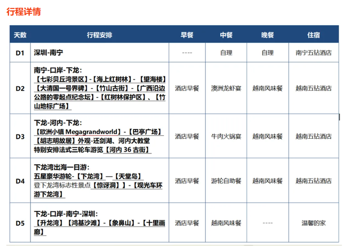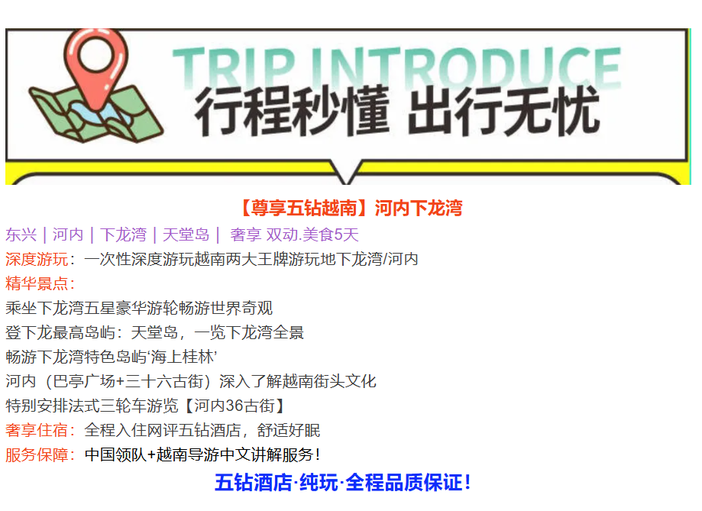 (6)越南时间比中国北京时间慢一小时;另行程里的时间仅供参考具体以当时游览时间为准;
