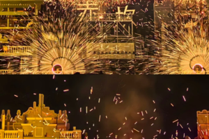 【铁树银花(火秀)】水上非遗打铁花,一种传统的民间表演艺术,通过将炽热的铁水舀起以击打的方式,