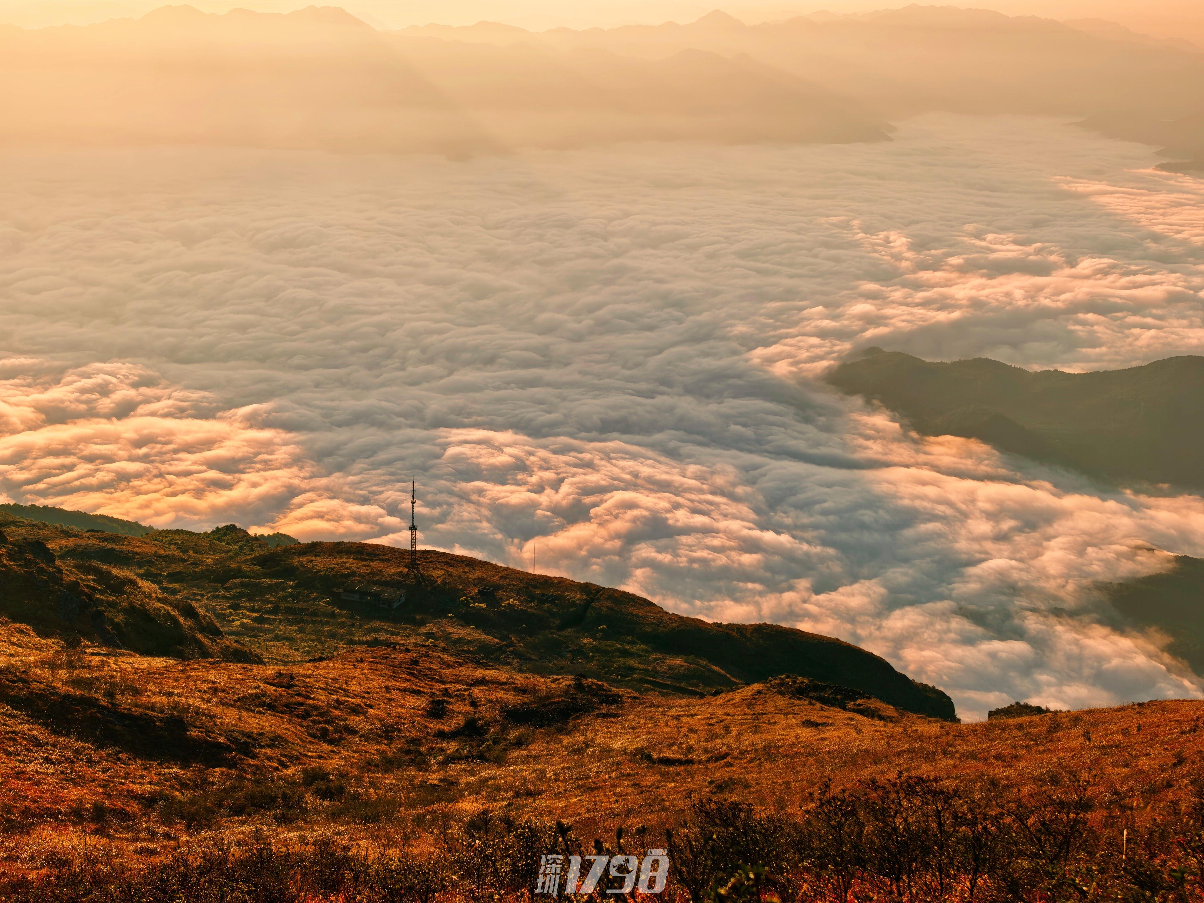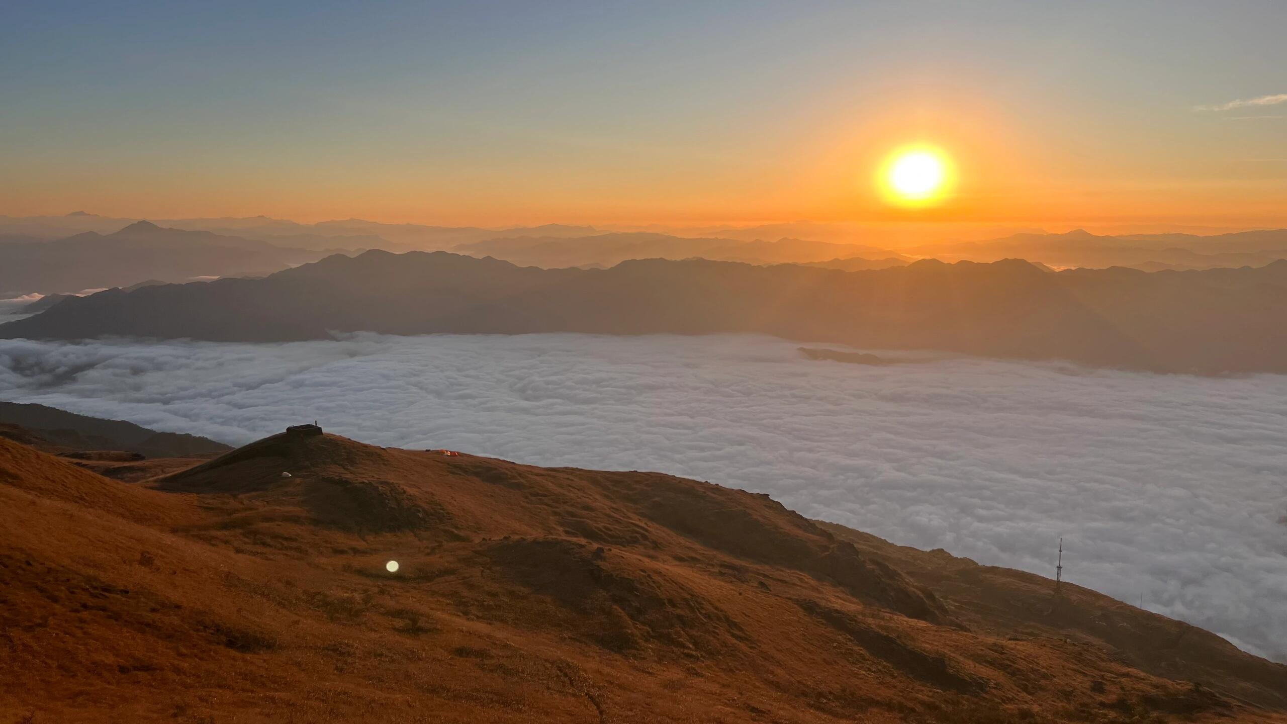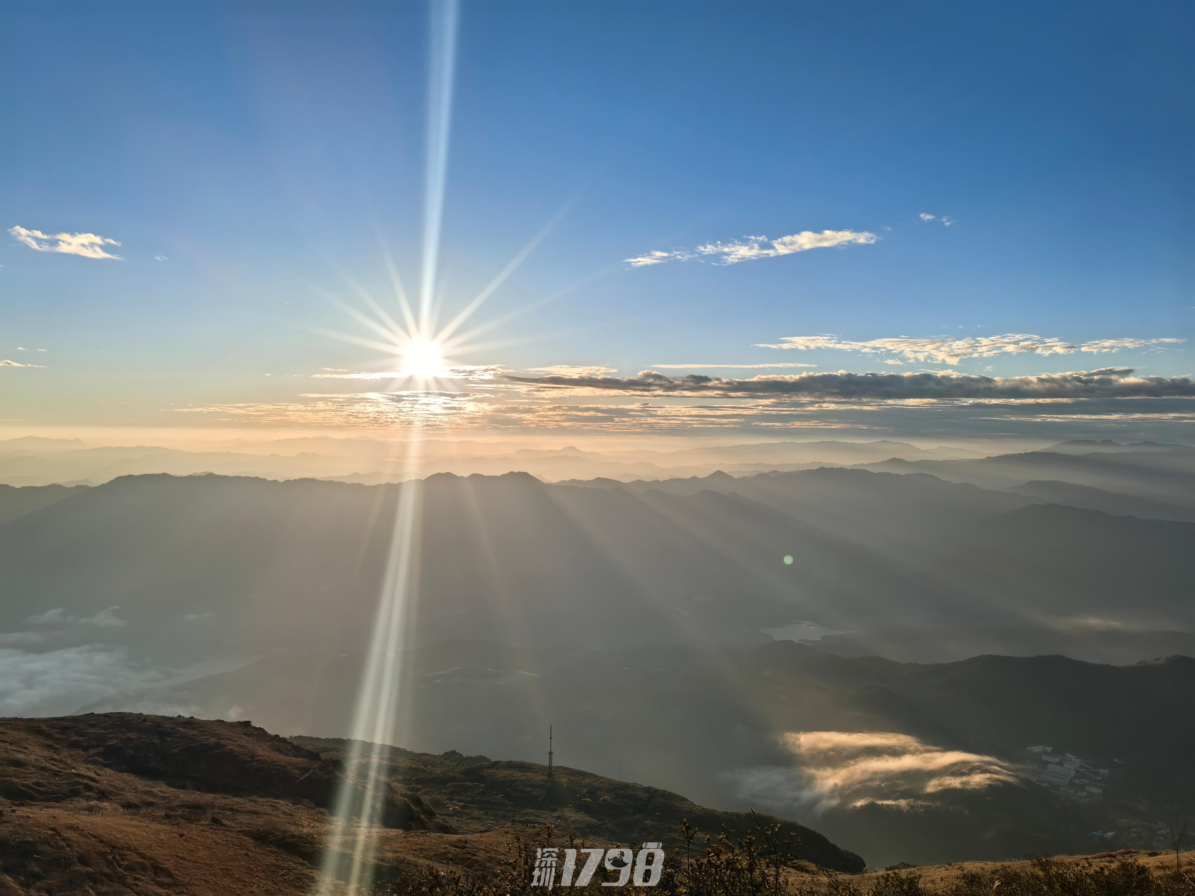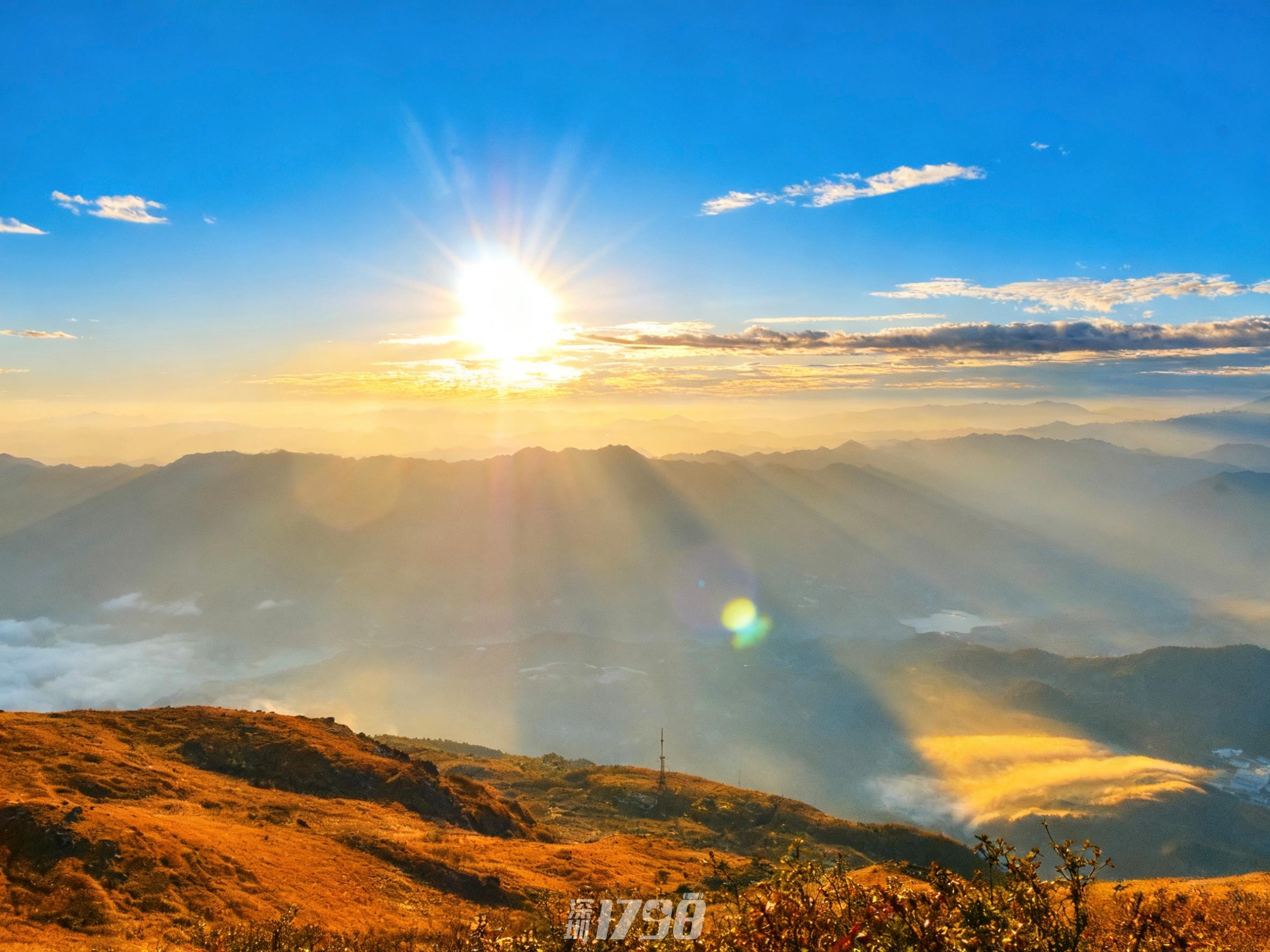 亮点2、【日出盛景】清晨站在山顶,第一缕阳光穿透云层,阳光洒在草甸上,美如仙境。