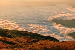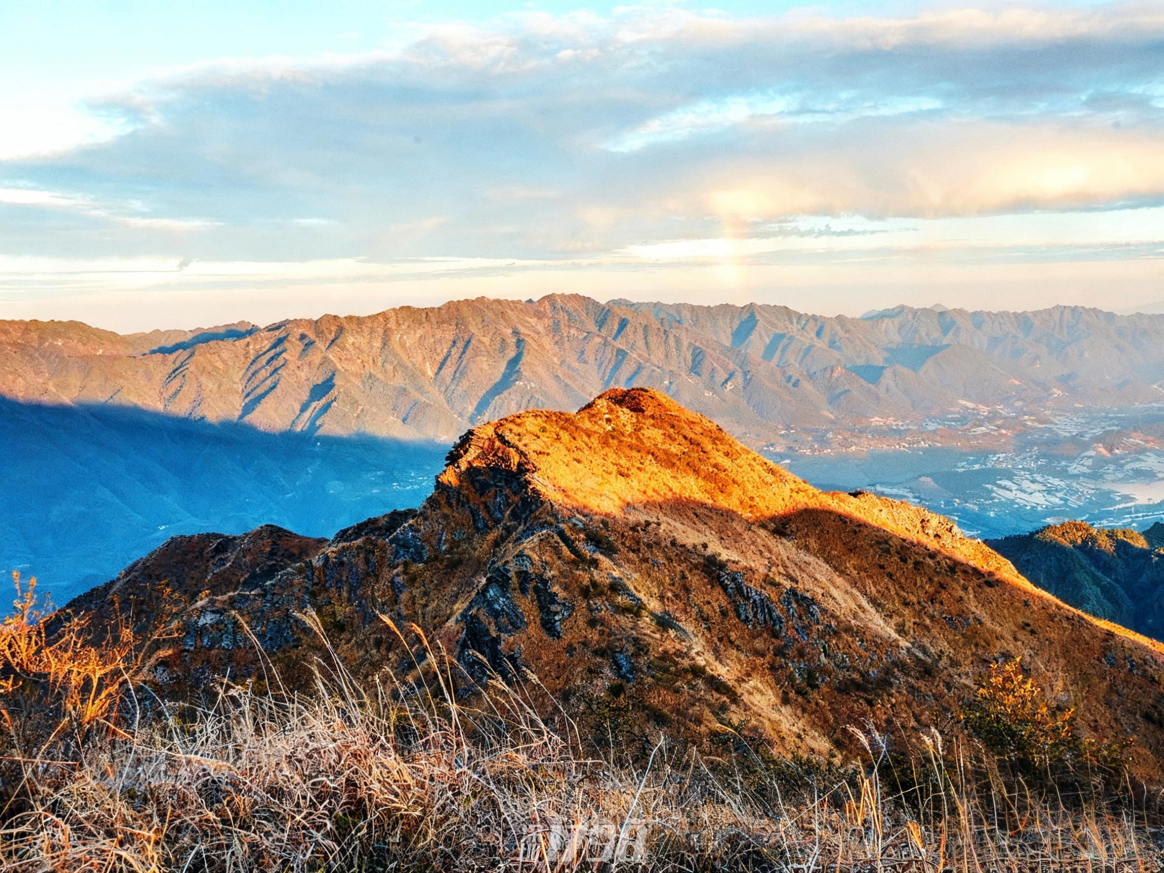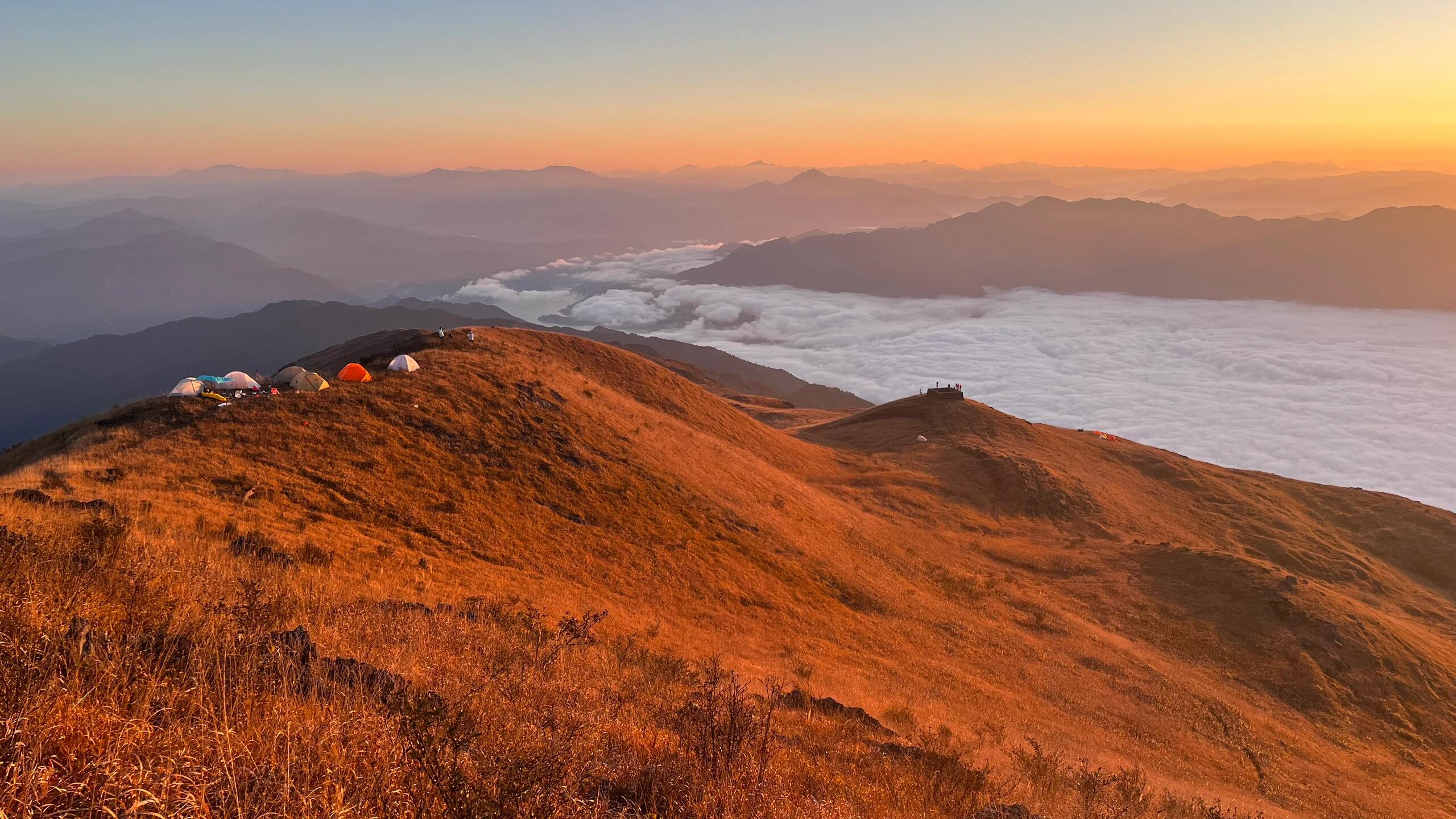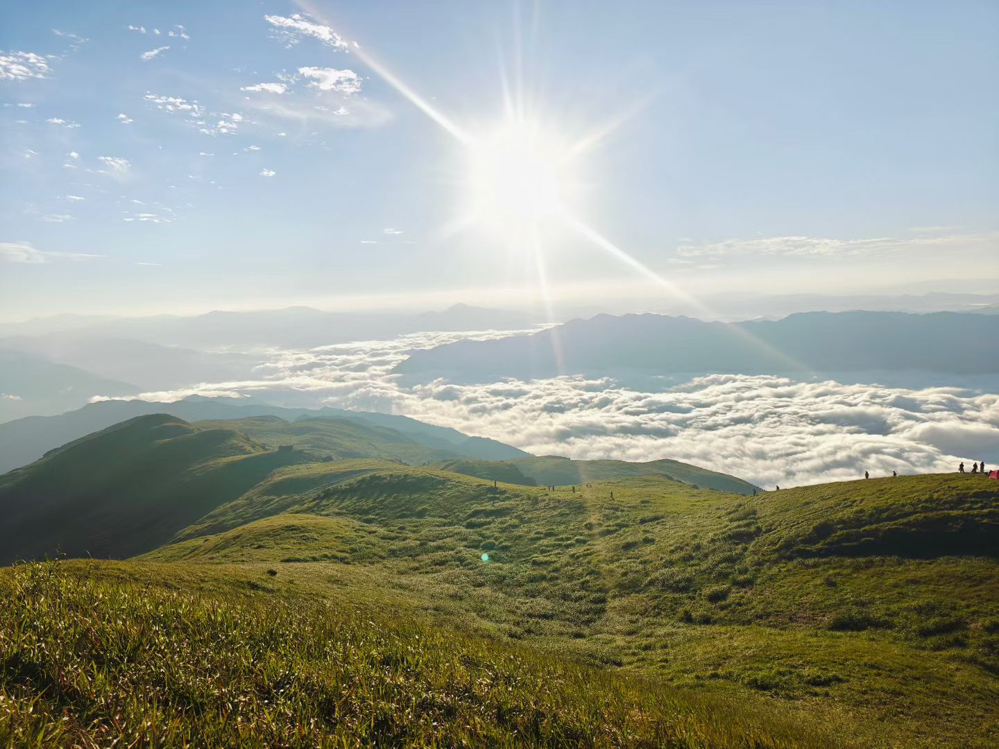 亮点2、【日出盛景】清晨站在山顶,第一缕阳光穿透云层,阳光洒在草甸上,美如仙境。