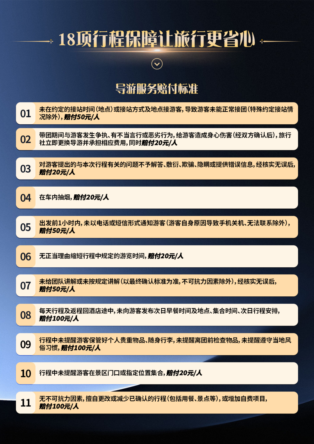 11. 如遇人力不可抗拒因素或政策性调整导致无法游览的景点(堵车、封路、塌方等),我社有权取消或更换为其它等价景点,赠送景点费用不退,并有权将景点及住宿顺序作相应调整;部分景区及酒店为方便旅游者有自设的商场提供旅游商品出售,这并不属于我社安排范畴,此类投诉恕我社无法受理,敬请留意。