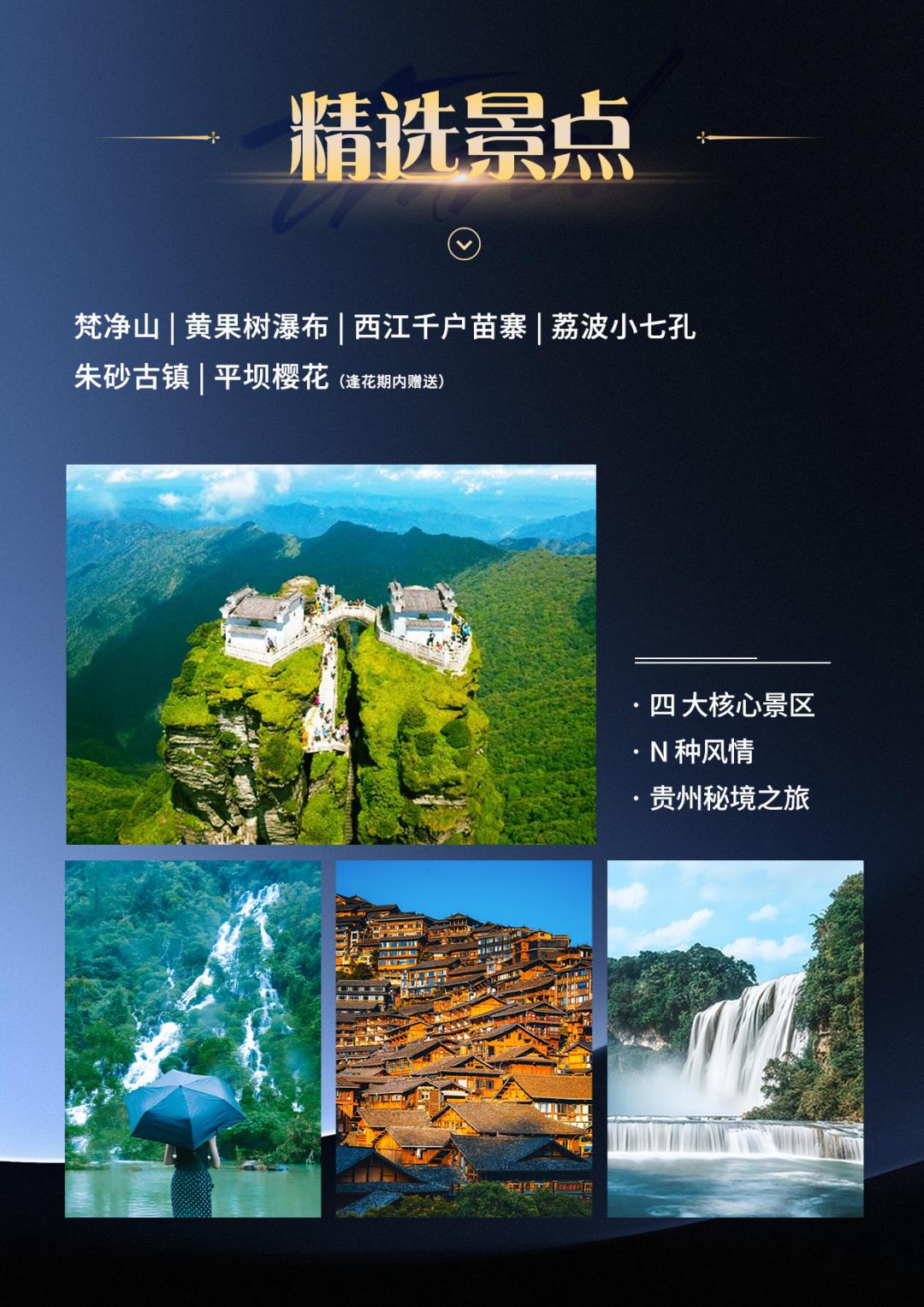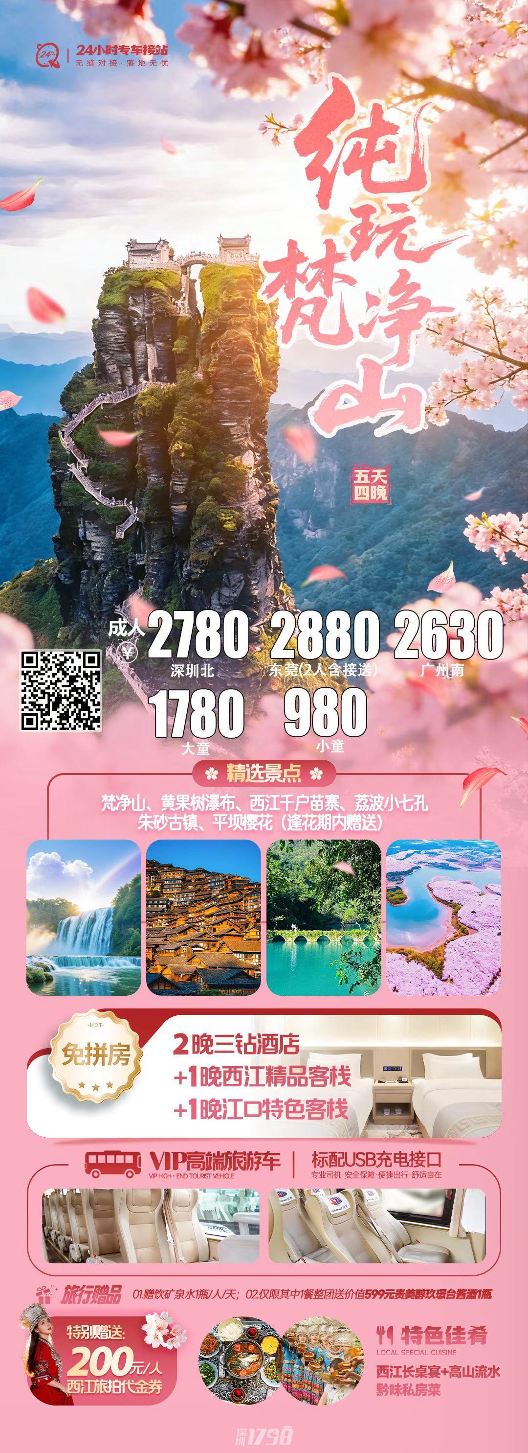(注:1.【甲秀楼】为赠送景点无任何退费;2.由于梵净山景区实行全网实名制购票且每日限购门票;旺季梵净山门票紧张,如梵净山东西门都未预约到门票,旅行社根据情况调整为其他景区或退费200元/人,敬请谅解!)。