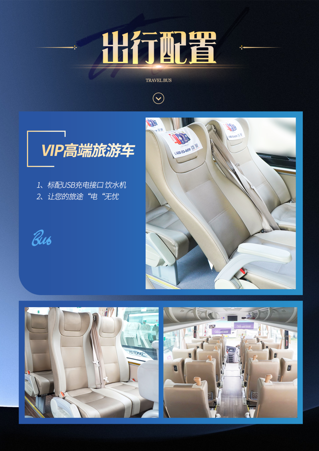 3. 用车:VIP豪华旅游车(车型不定,保证一人一座),标配USB充电接口、饮水机(根据团队人数情况用车,20人以下用车未标配USB、饮水机)