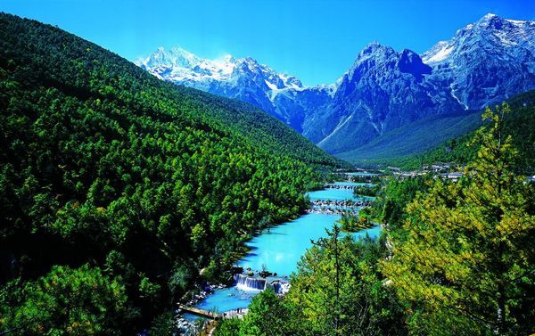 白水河是玉龙雪山脚下的一条河流,由雪山融水形成,因为水质非常清澈,流经过一段河床、台地都是白色岩石的地方,水也仿佛成了白色,因此得名。白水河流经玉龙雪山山脊的蓝月谷时颜色五光十色,非常奇幻漂亮,仿佛白色的宣纸上浸了彩。