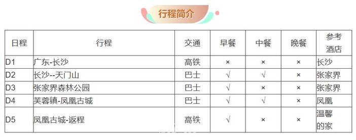 用房:4晚住宿(长沙一晚,张家界2晚,凤凰古城1晚)