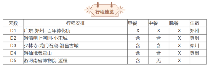 2、全程为旅游团队餐,标准不高,十人一桌、十菜一汤、不含酒水、主食不限,如需退餐,请在用餐前4小时提出,河南饭菜偏咸,口味较重,请入乡随俗,如实在不合口味,请及时和导游沟通改善,如果确因地方差异造成的不便之处,请多担待;