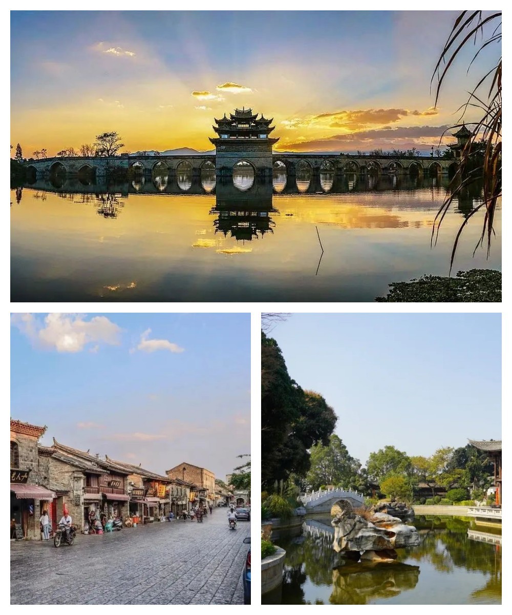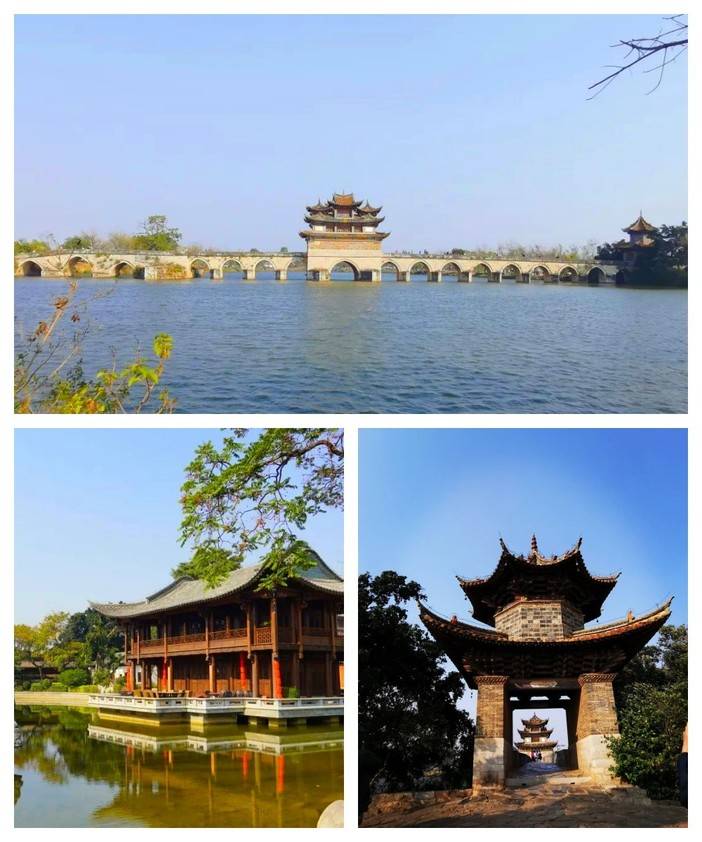 【双龙桥】俗称“十七孔桥”,是座三阁十七孔大石拱桥。它坐落于建水古城城西5里处,横跨泸江与塌冲河交汇之水面上,是云南省著名古迹之一