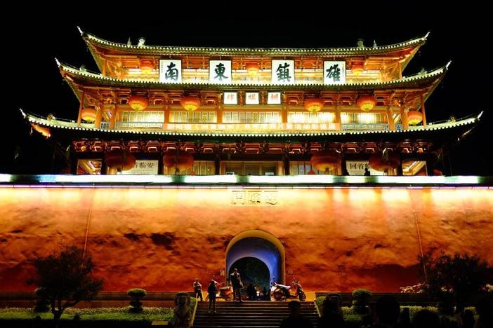 【朝阳楼外景】朝阳楼为古临安府城东城楼,以"东迎朝晖"而得名,是云南省保存较好、建筑宏伟的古城城楼。建于明洪武二十二年(1389年)。高24.45米,占地414平方米。