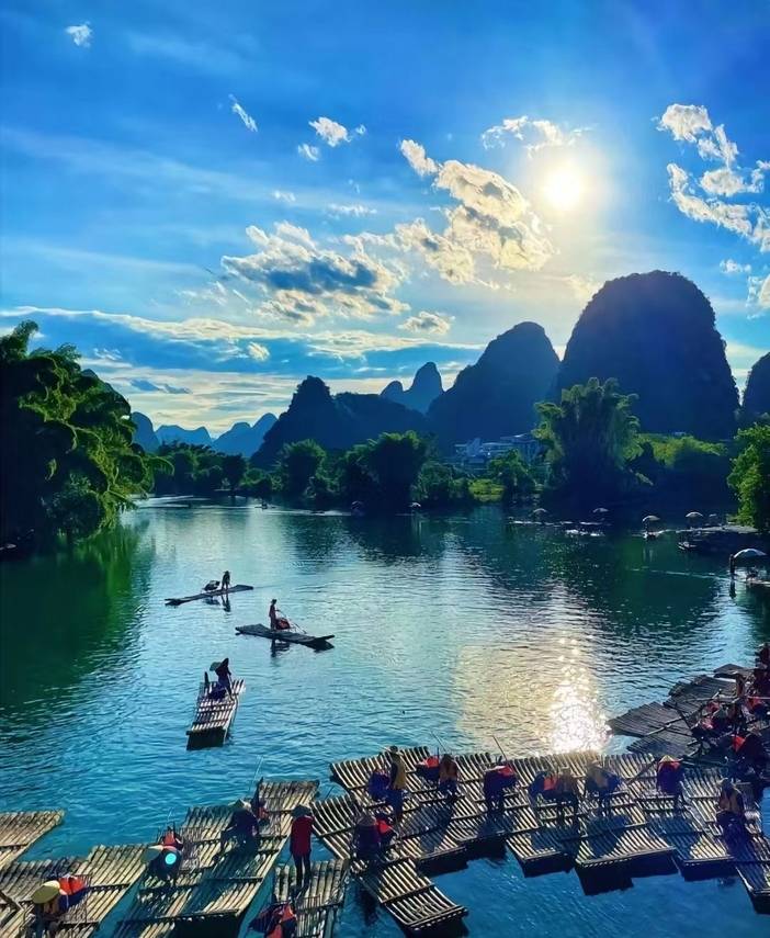 08:00乘车【多人竹筏】(门票已含,游览时间约为1.5小时)人称“小漓江”,不是漓江胜似漓江。在其上泛舟漂流,赏两岸桂林山色,才不虚此行。两岸山峦百态千姿,河畔翠竹叠嶂,蕉临四季常青,沿岸地稻田一年四季颜色不断变化,田野里一片生机勃勃,诗情画意尽显其中。