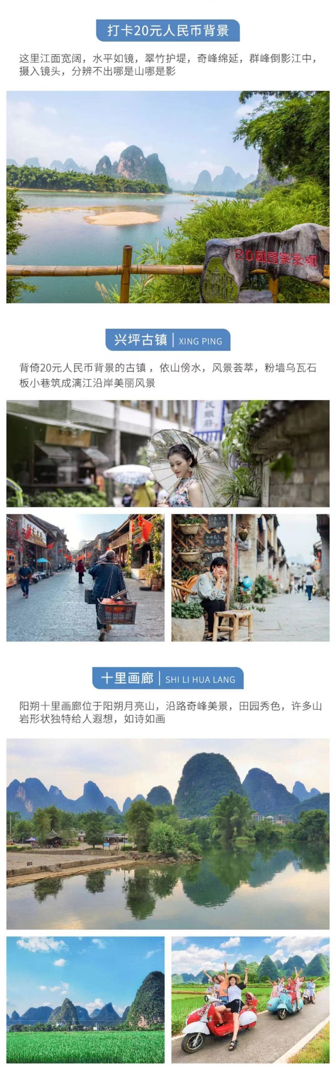 (阳朔属于小县城,节假日酒店会特别紧张,假期路上又塞车,因此第一天晚上不能保证住阳朔县城里,第二天晚上保证住阳朔,不会影响行程景点游览)