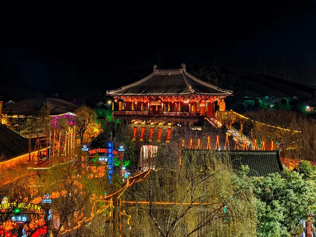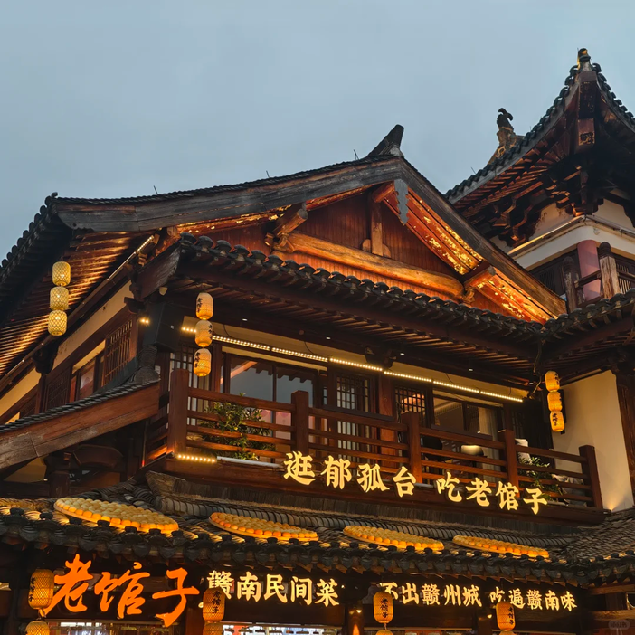 江南宋城不夜天:郁孤台历史文化街区华灯如昼,汉服少女提灯走过青石板,茶肆酒坊传出古乐声声,一秒穿越《清明上河图》的烟火夜市。