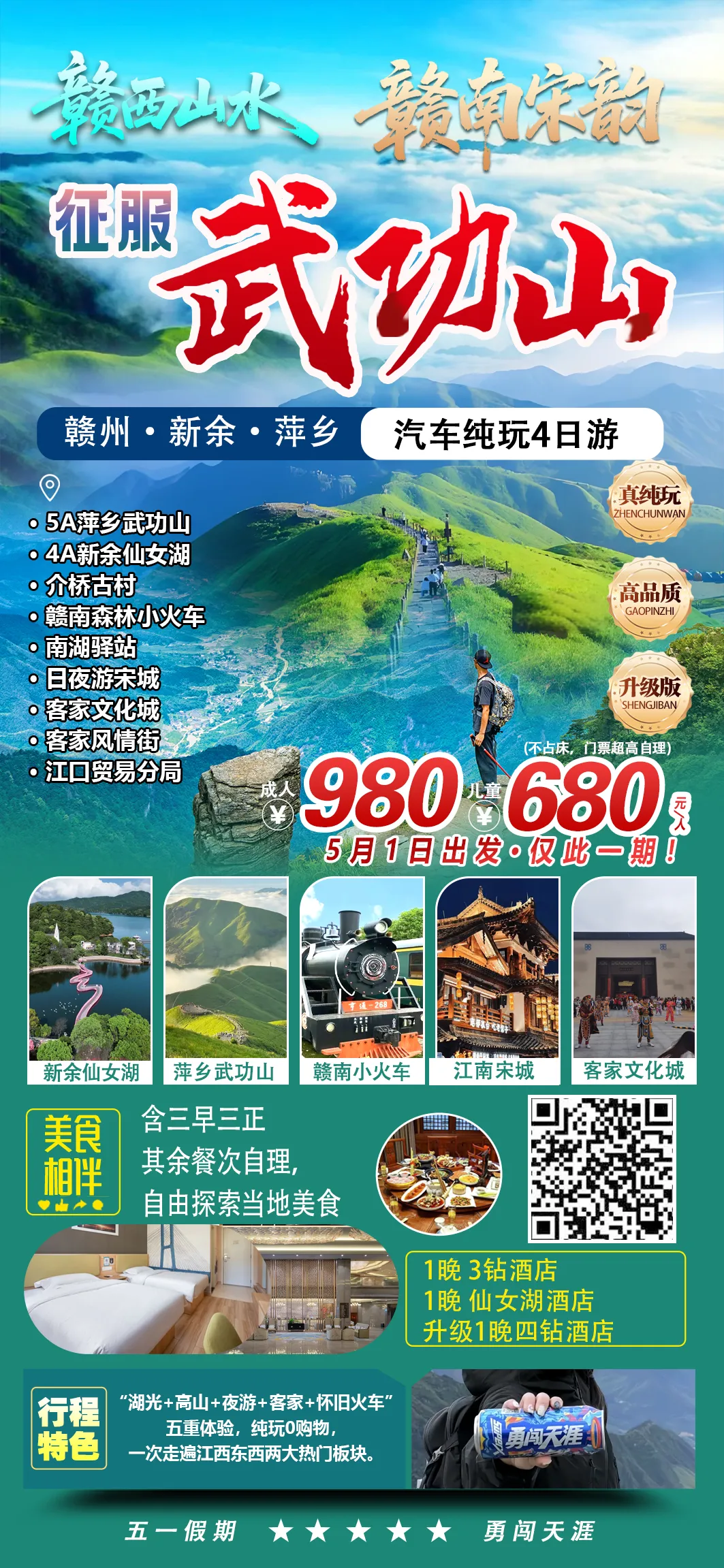 4.住宿:入住上犹酒店1晚3钻+仙女湖酒店1晚+升级一晚四钻酒店,如单男单女须补房差3晚共¥400元/人;